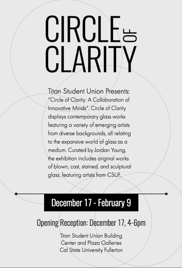 A Collaboration of Innovative Minds”. Circle of Clarity displays contemporary glass works featuring a variety of emerging artists from diverse disciplines, all relating to the expansive world of glass as a medium. The exhibition includes original works of blown, cast, stained, and sculptural glass, featuring artists from CSUF. Glass art at CSUF consists of a small group or community of talented artists; our group consists of animators, ceramicists, graphic designers, painters, and sculpture artists. Each work is not just a reflection of an individual’s inspiration, but of a dedicated team working together to bring a vision to life. There is a perpetual circle of exchanging knowledge, ideas, tricks, and skills which has developed all of our art exponentially. Circle of Clarity displays a collection of some of the best and brightest glass work from CSUF in 2018.